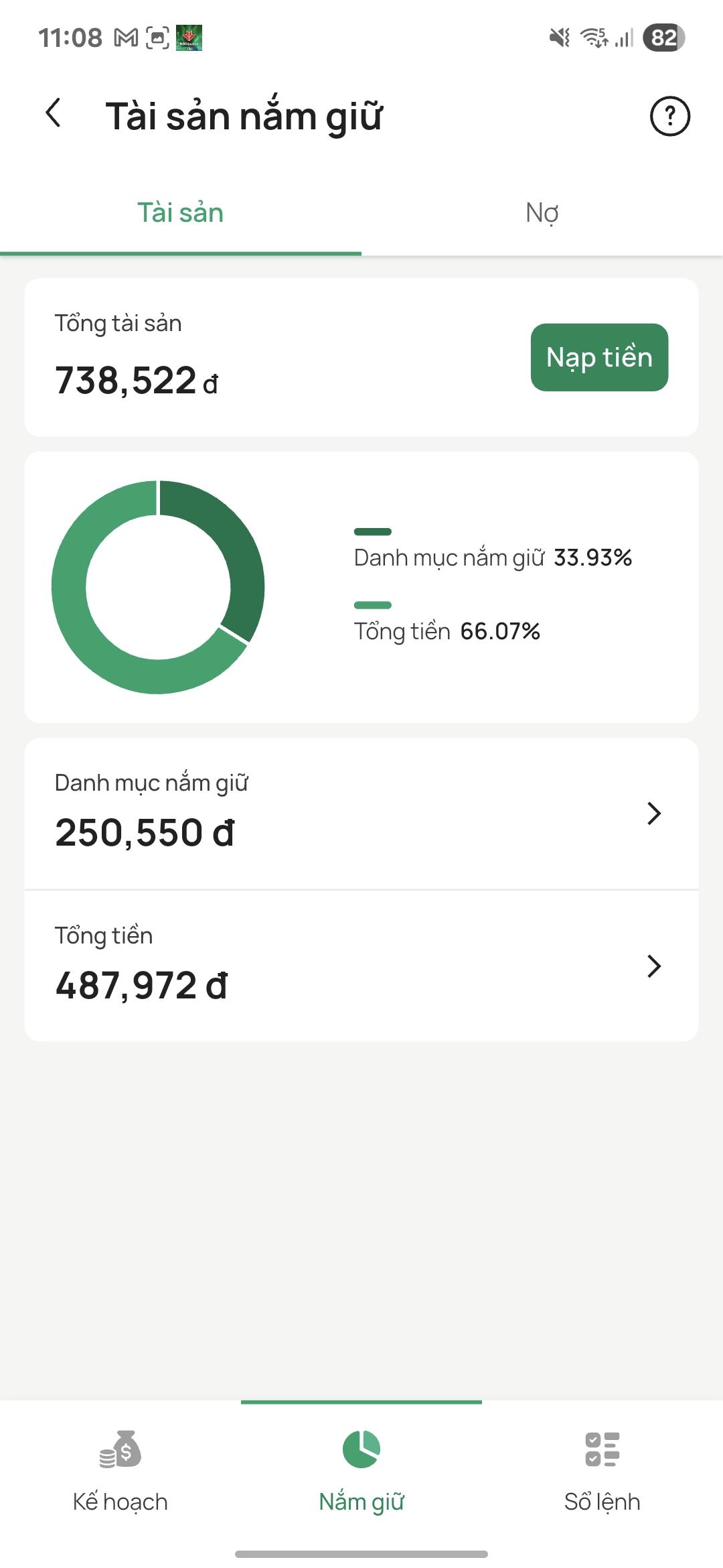 <mark style="color:green;">**Bước 1:**</mark> Từ sản phẩm **Tích sản**, chọn tab **nắm giữ** để xem trạng thái **tài sản** và **nợ**